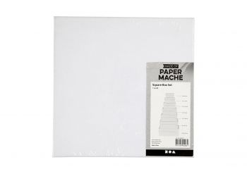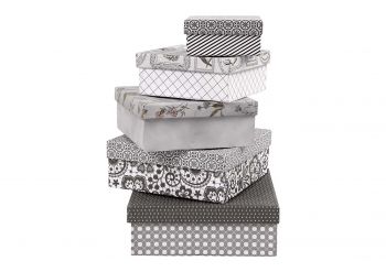 Neliönmuotoiset valkoiset kannelliset pahvirasiat, 7 eri kokoa.